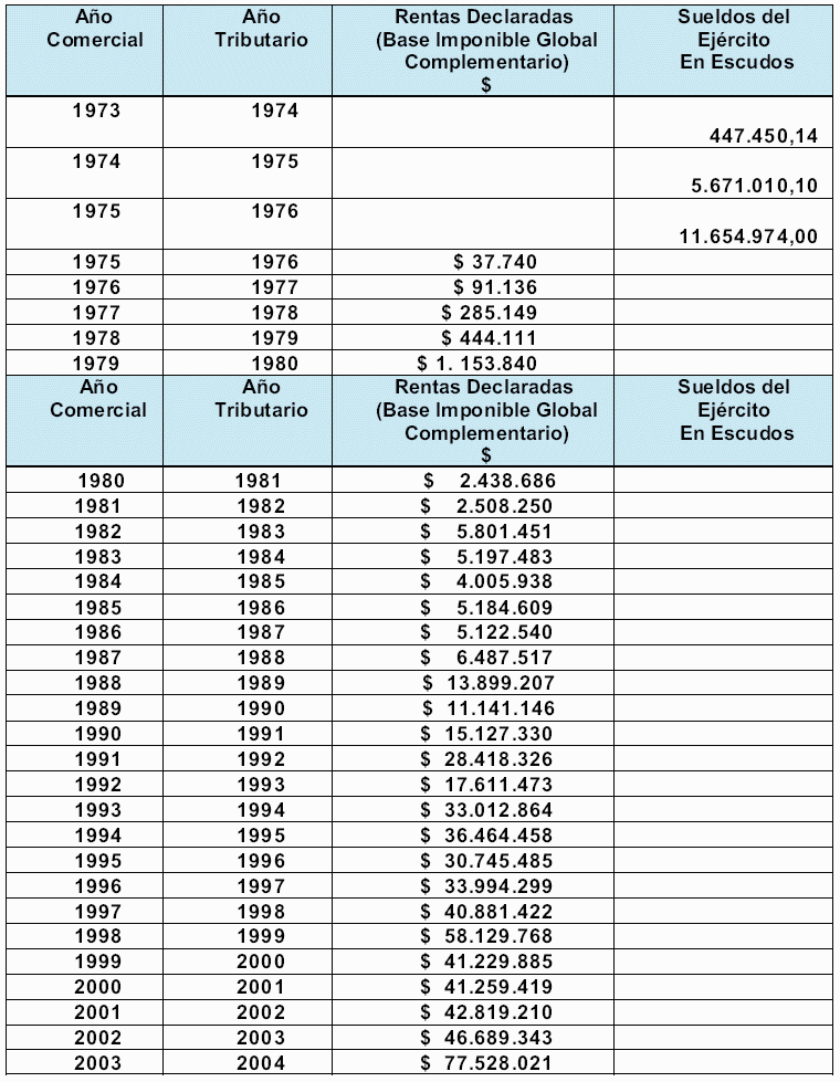e.- Augusto Pinochet Ugarte, para efectos de impuesto a la renta desde el año tributario 1974 a 2004, correspondientes a los años comerciales 1973 a 2003, y de acuerdo a documentación tenida a la vista, declaró diferentes cantidades de ingresos que se descomponen de la siguiente forma: